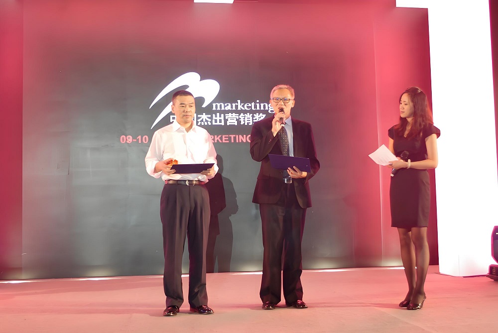(2012年,沈坤获得由经济观察报和香港营销学会联合举办的“中国营销杰出奖”,图为颁奖典礼接受奖牌)