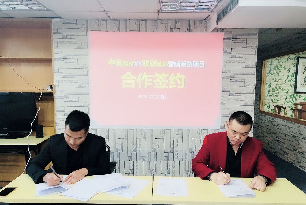 2018年12月18日下午,中食极材(广州)农业科技有限公司董事长谢云锋与CFO朱总,在深圳市双剑破局营销策划有限公司会议室,与著名营销策划专家沈坤老师签署了两家2019年度的营销策划合作协议,标志着两家经过10多天的沟通,终于迈出了实质性的一步。